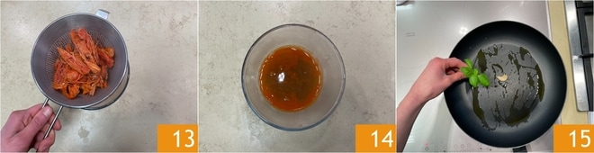 Nachdem die 20 Minuten vergangen sind, filtern Sie die Krabbensuppe 13, um die Brühe in einer Schüssel 14 aufzufangen. Bringen Sie Wasser zum Kochen, das für das Kochen der Pasta benötigt wird, und salzen Sie es. Jetzt geben Sie etwas Öl, eine Knoblauchzehe und einige Basilikumblätter in eine Pfanne 15.