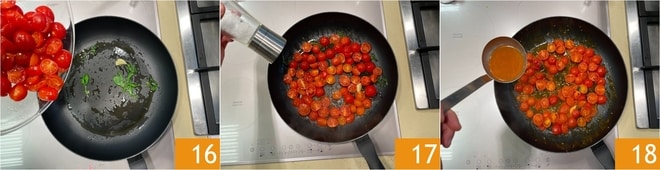 Lassen Sie es aromatisieren und fügen Sie die Kirschtomaten hinzu 16. Salzen Sie sie 17 und braten Sie sie an, bis sie weich werden, dann fügen Sie die Krabbensuppe hinzu 18 und kochen Sie sie 20 Minuten lang.