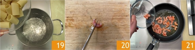 Wenn es noch etwa 10 Minuten dauert, können Sie die Paccheri ins kochende Wasser geben 19. Nehmen Sie die Garnelen heraus und halbieren Sie sie 20. Geben Sie etwas Öl in eine Pfanne, erhitzen Sie sie und geben Sie die Garnelen hinein 21. Braten Sie sie kurz an, nur ein paar Minuten.