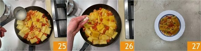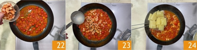 Übertragen Sie die Garnelen in die Pfanne mit den Kirschtomaten 22, fügen Sie eine Kelle Kochwasser 23 und die Paccheri hinzu, die Sie al dente abgegossen haben 24.