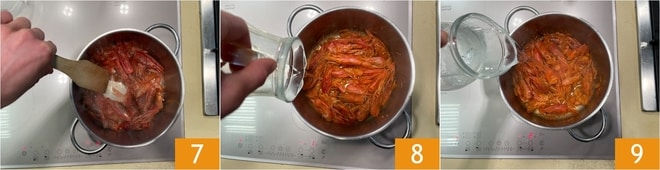 Rösten Sie sie gut an, indem Sie sie mit einem Holzlöffel zerdrücken 7. Nach 3 Minuten mit Weißwein ablöschen 8 und wenn der Alkohol verdampft ist, fügen Sie 300 g Wasser hinzu 9. Lassen Sie es etwa 20 Minuten kochen.