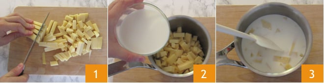 Um die Paccheri mit Radicchio und Fontina-Fondue zuzubereiten, beginnen Sie mit dem Fondue: Entfernen Sie die Rinde des Käses und schneiden Sie ihn in ziemlich kleine Würfel 1, dann geben Sie ihn in einen kleinen Topf und fügen die Milch hinzu 2. Lassen Sie es bei Raumtemperatur für etwa 2 Stunden ruhen, oder bis der Käse weich und fast gelatinös ist 3.