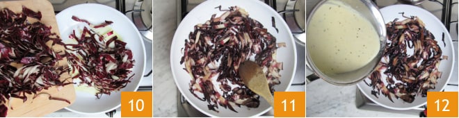 In der Zwischenzeit erhitzen Sie ein wenig Öl in einer Pfanne, fügen den Radicchio hinzu 10 und lassen ihn etwa 5 Minuten lang zusammenfallen 11, dann schalten Sie die Hitze aus. Wenn das Fondue fertig ist, gießen Sie es noch heiß in die Pfanne mit dem Radicchio 12.