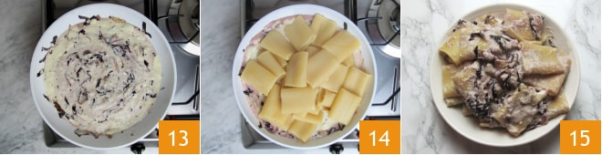 Gut umrühren, um den Radicchio mit dem Fondue zu vermengen 13, dann die Paccheri abtropfen lassen und in die Pfanne geben 14. Mischen, mit Salz und Pfeffer abschmecken und die Paccheri mit Radicchio und Fontina-Fondue sofort servieren 15!