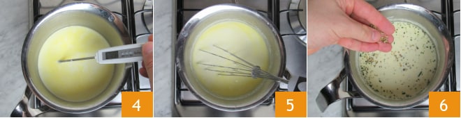 Nach der Einweichzeit setzen Sie den Topf bei niedriger Hitze auf den Herd: Um ein gutes Ergebnis zu erzielen, verwenden Sie ein Thermometer, um sicherzustellen, dass die Milch eine Temperatur zwischen 65° und 75° erreicht 4. Rühren Sie ständig mit einem Schneebesen, um die Mischung gleichmäßig zu vermengen 5, dann fügen Sie den gehackten Rosmarin und den Oregano hinzu 6.