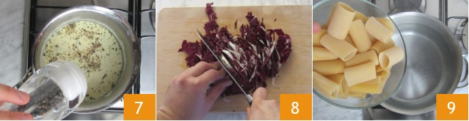 Würzen Sie mit Pfeffer 7 und rühren Sie bei milder Hitze weiter: Das Fondue muss insgesamt etwa 10-15 Minuten kochen, bis der ganze Käse geschmolzen ist und eine dicke Konsistenz hat. In der Zwischenzeit schneiden Sie den Radicchio in Streifen 8 und bringen einen Topf mit Wasser zum Kochen und salzen es. Geben Sie die Paccheri ins kochende Wasser 9 und kochen Sie sie nach der auf der Packung angegebenen Zeit.