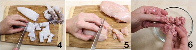 Reinigen und schneiden Sie die Tintenfische in Ringe 4 (für mehr Details können Sie den Anweisungen im Video der Kochschule „Wie man Tintenfische reinigt“ folgen), schneiden Sie das Huhn in Stücke 5, und zerbröseln Sie die Wurst mit den Händen 6.