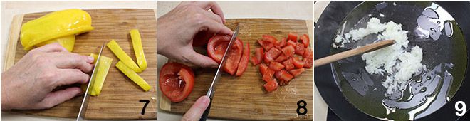 Waschen Sie die gelbe Paprika, entfernen Sie die Samen und die inneren Fasern, und schneiden Sie sie in Streifen 7. Waschen und putzen Sie auch die Tomaten, entfernen Sie die Samen und schneiden Sie sie in Stücke 8. Hacken Sie nun die Zwiebel fein und geben Sie sie zusammen mit 4-5 Esslöffeln extra nativem Olivenöl in die passende Paella-Pfanne (oder eine antihaftbeschichtete Pfanne) mit einem Durchmesser von etwa 32 cm 9.