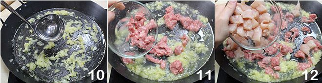 Dünsten Sie die Zwiebel bei niedriger Hitze an, indem Sie eine Kelle Hühnerbrühe hinzufügen, damit sie nicht verbrennt 10, dann geben Sie die Wurst 11 und das Huhn 12 hinzu.