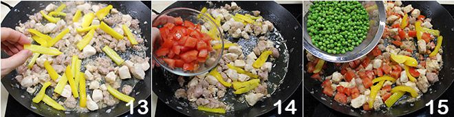 Braten Sie das Fleisch einige Minuten an, dann fügen Sie die Paprika 13, die Tomaten 14 und schließlich die abgetropften Erbsen 15 hinzu.