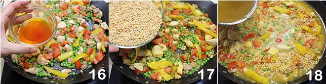 Fügen Sie etwas Brühe hinzu (etwa eine Kelle) und den Safran, den Sie in einer kleinen Menge Brühe aufgelöst haben 16, und lassen Sie alles für ein paar Minuten kochen. Geben Sie die Fregola hinzu und rühren Sie um 17, und fügen Sie die restliche Brühe hinzu 18 (wir empfehlen, ein paar Kellen Brühe zurückzuhalten, um sie hinzuzufügen, falls die Paella zu trocken wird);