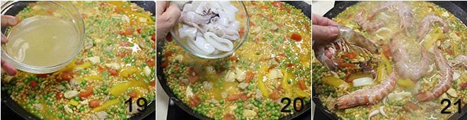 Decken Sie alles mit dem Kochsud der Miesmuscheln ab, den Sie beiseite gestellt hatten. Lassen Sie die Paella bei mittlerer Hitze etwa 20 Minuten kochen (die Garzeiten der Fregola können variieren: Überprüfen Sie die auf Ihrer Fregolapackung angegebene Kochzeit). Nach 10 Minuten, während derer Sie die Fregola häufig umrühren und bei Bedarf Brühe hinzufügen, geben Sie die Tintenfische 20 hinzu und nach 5 Minuten auch die Garnelen 21.