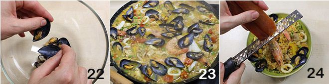 Nun bleibt nur noch das letzte Element hinzuzufügen: die Miesmuscheln. Entfernen Sie eine der beiden Schalen, die ohne Muschel 22, und fügen Sie die Miesmuscheln gegen Ende der Garzeit zur Paella hinzu 23 (etwa 3 Minuten bevor Sie den Herd ausschalten). Sobald die Alghero-Paella fertig ist, pfeffern Sie nach Belieben und richten Sie sie an. Zum Abschluss reiben Sie reichlich Meeräschen-Bottarga in Scheiben über jeden Teller 24 und, wenn Sie möchten, beträufeln Sie sie mit einem Schuss extra nativem Olivenöl.