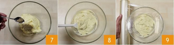 Jetzt, da die Mayonnaise fertig ist, fügt den Kümmel hinzu 7, rührt um 8 und deckt dann die Schüssel mit Frischhaltefolie ab 9, um die Mayonnaise im Kühlschrank bis zum Gebrauch aufzubewahren (wenn ihr wollt, könnt ihr alternativ die falsche Mayonnaise ohne Ei zubereiten, der ihr den Kümmel hinzufügt).