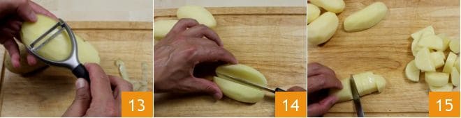 Wascht dann die Kartoffeln unter fließendem Wasser, schält sie mit einem Sparschäler 13 oder der Klinge eines kleinen Messers und halbiert sie 14. Legt jede Hälfte mit der Schnittfläche nach unten auf das Schneidebrett und schneidet daraus etwa 1 cm dicke Halbmonde 15.