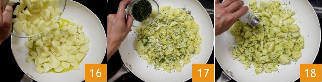In einer großen Pfanne das Öl einfüllen, bis der Boden bedeckt ist, und es für einen Moment erhitzen. Dann die geschnittenen Kartoffeln hineingeben 16 und bei mittlerer Hitze etwa 20-25 Minuten unter häufigem Wenden garen, bis sie von allen Seiten gut gebräunt sind. Dann die zuvor gehackte Mischung aus aromatischen Kräutern hinzufügen 17, umrühren und 1-2 Minuten ziehen lassen. Hitze ausschalten und nach Belieben mit Salz abschmecken 18.