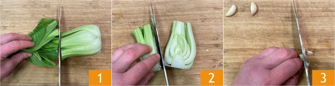 Um Pak Choi im Wok zuzubereiten, waschen Sie zunächst den Pak Choi und entfernen Sie den unteren Teil des Stiels, dann schneiden Sie die Blätter ab und legen Sie sie beiseite 1. Teilen Sie den Stiel der Länge nach in 4 Teile 2. Hacken Sie die Knoblauchzehen fein 3.