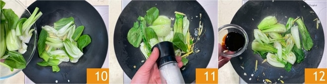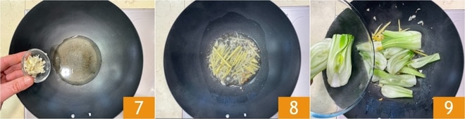 Fügen Sie den Knoblauch 7, den Ingwer 8 und die Pak Choi Stiele hinzu 9.