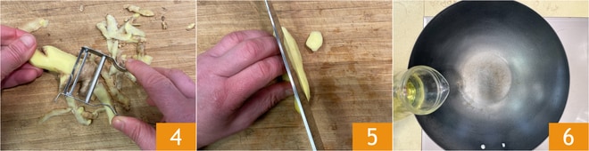 Schälen Sie zuletzt die Ingwerwurzel 4 und schneiden Sie sie in Stifte 5. Stellen Sie den Wok auf den Herd und wenn er heiß ist, geben Sie das Pflanzenöl hinzu 6.