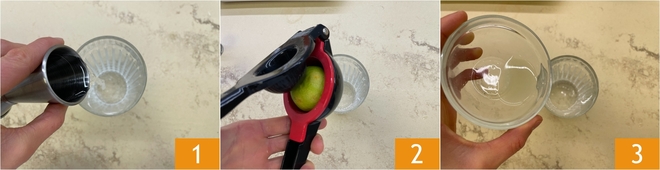 Um den Cocktail Paloma zuzubereiten, beginnen Sie damit, den Tequila in ein hohes Glas (Tumbler) zu gießen 1. Beachten Sie, dass Sie mit diesen Mengen 2 Cocktails erhalten. Pressen Sie die Limette mit einer Zitruspresse aus, um den Saft zu filtern 2, und geben Sie ihn zusammen mit dem Tequila ins Glas 3.