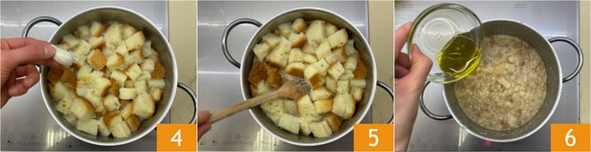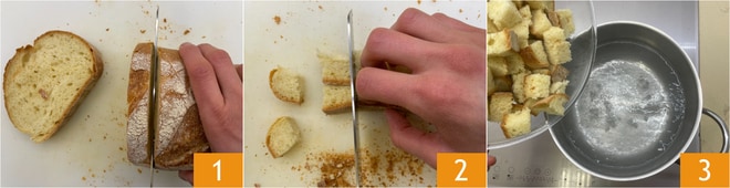 Um die toskanische Brotsuppe zuzubereiten, schneiden Sie das alte Brot zuerst in Scheiben 1 und dann in Würfel 2. Bringen Sie das Wasser in einem Topf zum Kochen, dann salzen Sie es und fügen Sie das Brot hinzu 3.