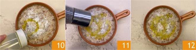 Schließlich beenden Sie es mit einem Schuss Öl 10 und einer Prise Pfeffer 11. Ihre Brotsuppe ist bereit zum Genießen 12!