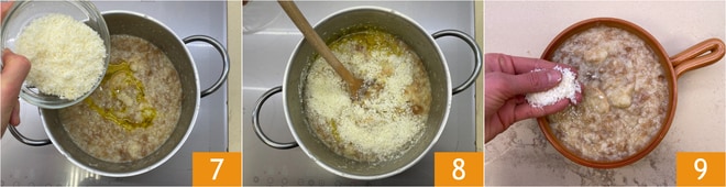 Würzen Sie mit geriebenem Parmesan 7 und rühren Sie ein letztes Mal um 8. Servieren Sie es und garnieren Sie mit weiterem geriebenem Parmesan 9.