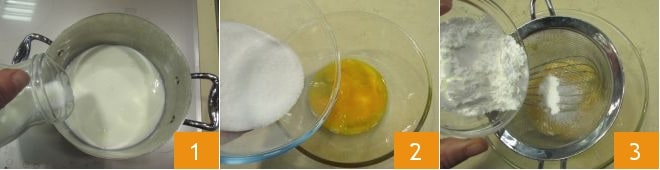 Um die Pandoro-Creme-Nutella®-Becher zuzubereiten, geben Sie die Milch in einen kleinen Topf 1 und erhitzen Sie sie bei niedriger Hitze, bis sie fast kocht. In einer Schüssel die Eigelbe und den Zucker 2 geben, dann mit einem Schneebesen vermischen und wenn der Zucker aufgenommen ist, die gesiebte Maisstärke in ein Sieb geben 3; die trockenen Zutaten gut vermischen.