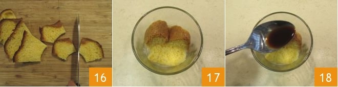 Die Pandoroscheiben in Stücke schneiden, je nach Form Ihrer Gläser (wir haben Gläser mit einem Fassungsvermögen von 20 cl verwendet) 16. Alles ist bereit, um die Desserts zu komponieren: 2-3 Stücke Pandoro auf den Boden des Glases legen 17, mit Kaffee befeuchten 18,