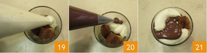 dann eine kleine Portion Creme aufdrücken 19. Auch Nutella® in einen Spritzbeutel mit 6 mm Tülle geben und eine kleine Portion ins Glas drücken 20, abwechselnd die Schichten von Creme und Nutella® fortsetzen, um einen marmorierten Effekt zu erzielen. Die Becher bis zum Rand füllen und sofort servieren 21!