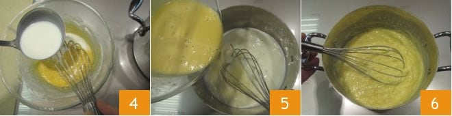 Inzwischen den Topf vom Herd nehmen und die geschlagenen Eier mit einem Löffel heißer Milch leicht verdünnen 4. Gut mischen, dann den Milchtopf wieder auf den Herd stellen und die Mischung mit den Eiern hineingeben 5. Weiter langsam kochen und ständig mit einem Schneebesen die Creme rühren, bis sie eindickt 6, dies dauert etwa 10-15 Minuten.