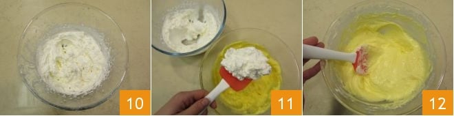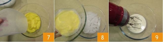 bis sie schaumig ist 10. Die geschlagene Sahne zur inzwischen kalten Creme geben 11 und vorsichtig mit einem Spatel von unten nach oben mischen, um die Mischung nicht zu entlüften 12; fortfahren, bis die gesamte Sahne nach und nach eingearbeitet ist.