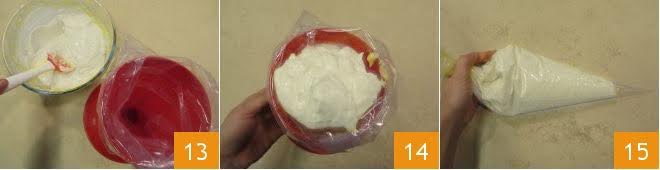 Die erhaltene Creme in einen Spritzbeutel mit glatter 10 mm Tülle geben (13-14-15) und in den Kühlschrank stellen.