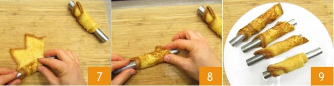 Während Sie die Scheiben rösten, rollen Sie sie noch warm um ein Cannoli-Rohr mit einem Durchmesser von ca. 1 cm 7, indem Sie die Enden leicht andrücken 8. Stellen Sie die Cannoli für 15 Minuten in den Kühlschrank, um sie zu festigen 9.