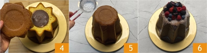 Deckt den Pandoro mit der abgeschnittenen Kappe ab 4, bestäubt die Oberfläche dann mit Puderzucker 5 und garniert mit Beerenfrüchten 6. Lasst den Pandoro gefüllt mit NUTELLA Eis für etwa 10 Minuten bei Raumtemperatur stehen, bevor ihr ihn serviert und anschneidet!