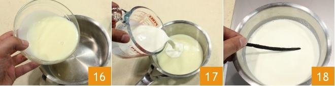 Inzwischen die englische Creme zubereiten: Die Kondensmilch in einen kleinen Topf geben 16, dann die Sahne hinzufügen 17. Den Topf auf niedrige Hitze stellen und eine aufgeschnittene Vanilleschote hineinlegen 18: alles zum Kochen bringen.