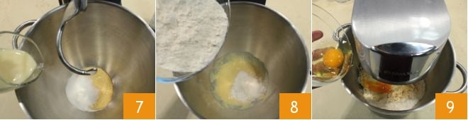 dann die Kondensmilch 7 und das gesiebte Mehl 8; dann die Küchenmaschine mit dem Flachrührer einschalten und die Eier einzeln hinzufügen, wobei darauf gewartet wird, dass das vorherige Ei aufgenommen wird, bevor man mit dem nächsten fortfährt 9.
