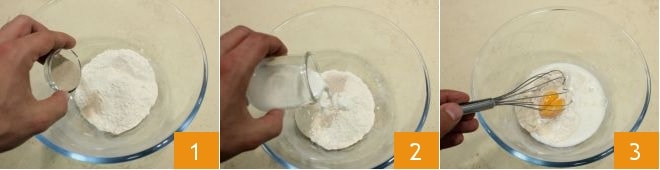 Um den Pandoro mit Kondensmilch und Schokoladentropfen zuzubereiten, beginnen Sie mit dem Vorteig: In einer Schüssel das gesiebte Mehl, die Trockenhefe 1 (wenn Sie frische Hefe verwenden, können Sie 15 g im lauwarmen Milch auflösen); dann die lauwarme Milch 2 und ein Eigelb hinzufügen, und mit dem Schneebesen verrühren 3.
