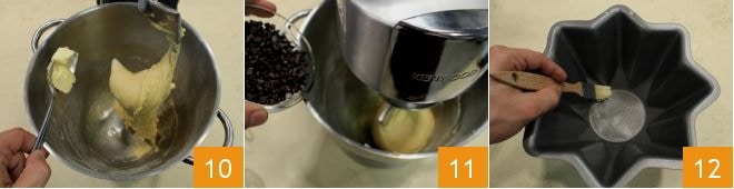 Wenn der Teig homogen ist und sich von den Wänden löst, den Flachrührer durch den Knethaken ersetzen, die Küchenmaschine einige Minuten laufen lassen, dann die weiche Butter Stück für Stück hinzufügen, wobei darauf gewartet wird, dass der vorherige Stück aufgenommen wird, bevor man mit dem nächsten fortfährt 10. Wenn die ganze Butter eingearbeitet ist, die Schokoladentropfen hinzufügen 11. Nehmen Sie die Pandoro-Form mit einem Fassungsvermögen von 750 g und fetten Sie sie sorgfältig ein 12.