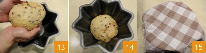 Legen Sie den Teig auf eine leicht eingefettete Arbeitsfläche, formen Sie ihn zu einer Kugel und geben Sie ihn in die Pandoro-Form (13-14); mit einem sauberen Tuch abdecken 15 und aufgehen lassen, bis er den Rand der Form erreicht hat (das dauert etwa 6 Stunden).