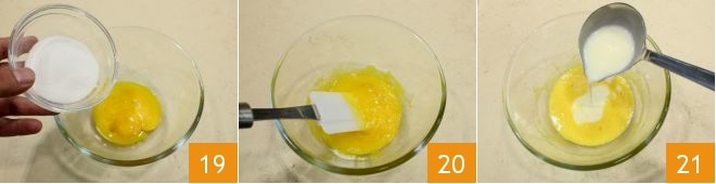 In einer kleinen Schüssel die Eigelbe geben, den Zucker hinzufügen 19 und zu einer Creme verrühren 20, dann die zuvor erhitzte Sahne mit der Kondensmilch hinzufügen 21.