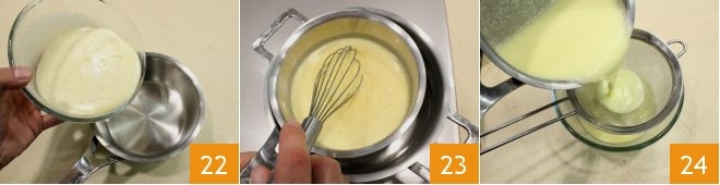 Dann die Mischung in den Topf zurückgeben, in dem Sie die Sahne und die Kondensmilch erhitzt haben 22 und den Topf im Wasserbad erhitzen, wobei darauf zu achten ist, dass das Wasser des größeren Topfes den Boden des kleinen Topfes, in dem Sie die Creme haben, nicht berührt; mit einem Schneebesen umrühren 23 und die Creme auf 83°C erhitzen, indem Sie die genaue Temperatur mit einem Küchenthermometer messen. Dann das Feuer ausschalten und die Creme durch ein Sieb geben, um Klumpen und Rückstände der Vanilleschote zu entfernen 24.