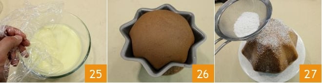 Mit Frischhaltefolie abdecken 25 und bei Raumtemperatur abkühlen lassen, dann bis zur Verwendung im Kühlschrank aufbewahren. Wenn der Pandoro aufgegangen ist, ihn zum Backen in den Ofen stellen: Eine Schale mit Wasser auf der untersten Schiene des Ofens stellen, dann den Pandoro im vorgeheizten statischen Ofen bei 170°C für 55 Minuten backen. Vor dem Herausnehmen die Garprobe mit einem Zahnstocher machen. Nach dem Backen herausnehmen 26, dann auf einem Servierteller umdrehen und vollständig abkühlen lassen. Sobald er abgekühlt ist, nach Belieben mit Puderzucker bestäuben 27: Der Pandoro mit Kondensmilch und Schokoladentropfen ist bereit, serviert zu werden!