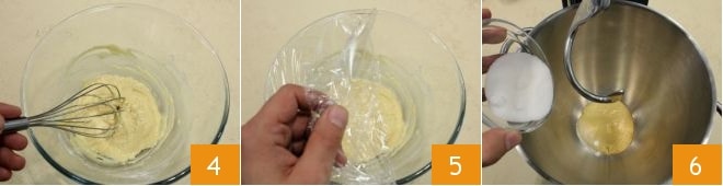 bis ein homogener Teig entsteht 4; mit Frischhaltefolie abdecken 5 und 1 Stunde bei Raumtemperatur gehen lassen, bis sich das Volumen verdoppelt hat. Nach der nötigen Zeit den Vorteig in die Schüssel einer Küchenmaschine geben, den Zucker hinzufügen 6