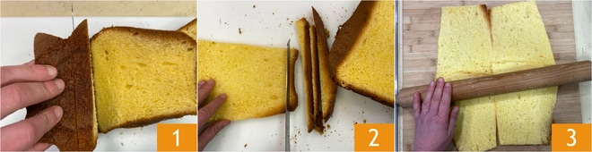 Um die Pandoro-Rolle zuzubereiten, schneiden Sie zuerst den Pandoro in vertikale Scheiben 1 und entfernen Sie die dunkle Außenseite 2. Legen Sie die Scheiben nebeneinander auf die Arbeitsfläche, um ein Rechteck zu bilden, und drücken Sie sie mit einem Nudelholz flach, um sie miteinander zu verbinden 3.