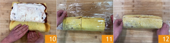 Rollen Sie die Pandorobasis vorsichtig auf 10, wickeln Sie die Rolle in Frischhaltefolie 11 und schließen Sie sie zu einem Bonbon 12. Lassen Sie sie 3 Stunden im Gefrierschrank oder über Nacht im Kühlschrank ruhen.