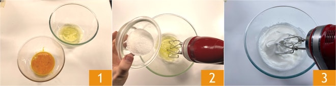 Um das Pandoro-Tiramisu zuzubereiten, bereiten Sie die Mascarponecreme zu: Trennen Sie sorgfältig die Eigelbe von den Eiweißen 1: Beginnen Sie, die Eiweiße mit den Quirlen zu schlagen und geben Sie dabei nach und nach 60 g Zucker hinzu 2 und schlagen Sie sie fast steif 3.