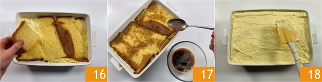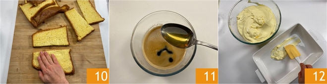 Legen Sie die Pandoro-Scheiben, bis der Boden vollständig bedeckt ist 13. Tränken Sie sie mit dem aromatisierten Kaffee 14. Tränken Sie sie nicht zu stark. Geben Sie die Hälfte der Creme darauf 15 und glätten Sie sie.