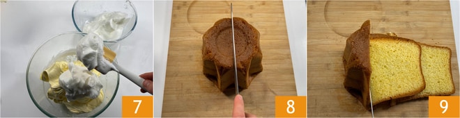Führen Sie dann vorsichtig den restlichen Teil ein, indem Sie mit Bewegungen von oben nach unten mischen 7. Teilen Sie den Pandoro in der Mitte 8 und schneiden Sie Scheiben von etwa 1 cm Dicke 9.
