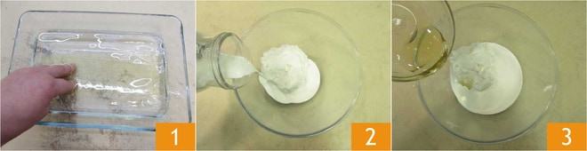Um den Pandoro- Joghurt- und Nutella®-Riegel herzustellen, weichen Sie die Gelatineblätter 10 Minuten lang in kaltem Wasser ein 1. In eine Schüssel geben Sie den griechischen Joghurt, 100 g Sahne 2, den Honig 3,